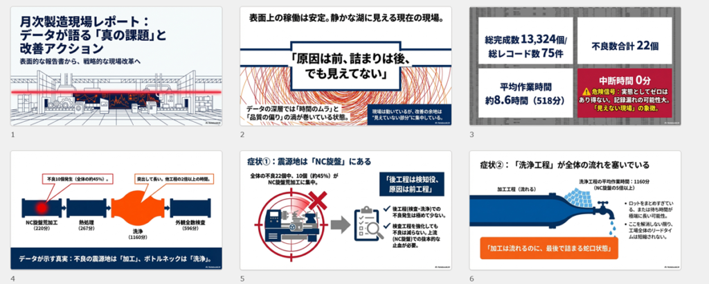 この流れの良さは、AIだけで資料を作るのではなく、生産管理システムに蓄積された実データを起点にできることです。