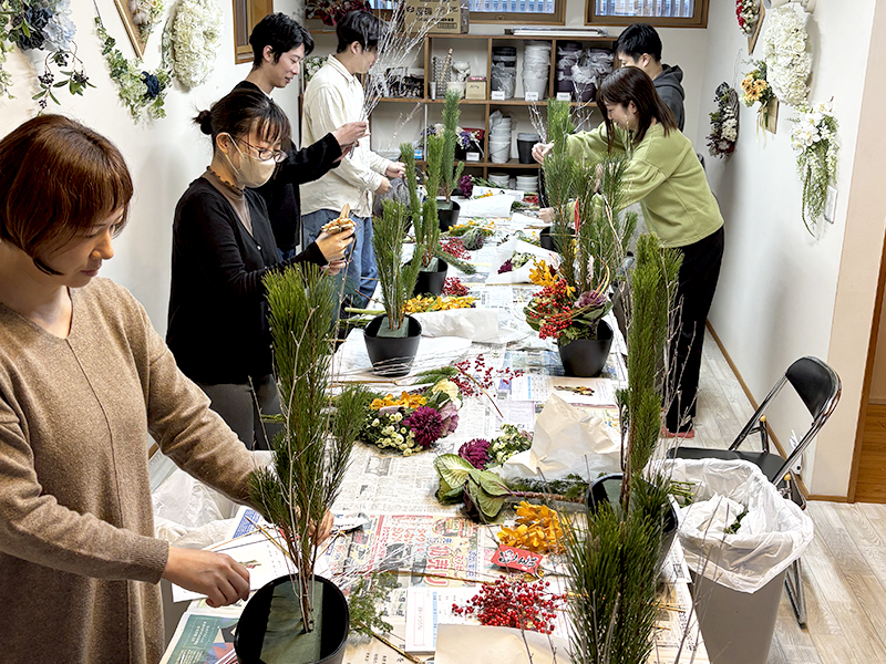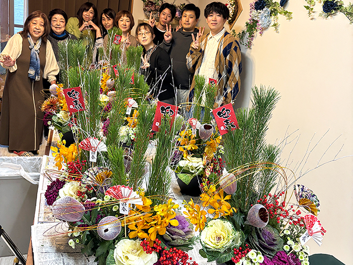 松や南天、葉牡丹などの生花のほか水引やお正月飾りなどもうまく使い、それぞれオリジナリティあふれる作品を仕上げることができました。