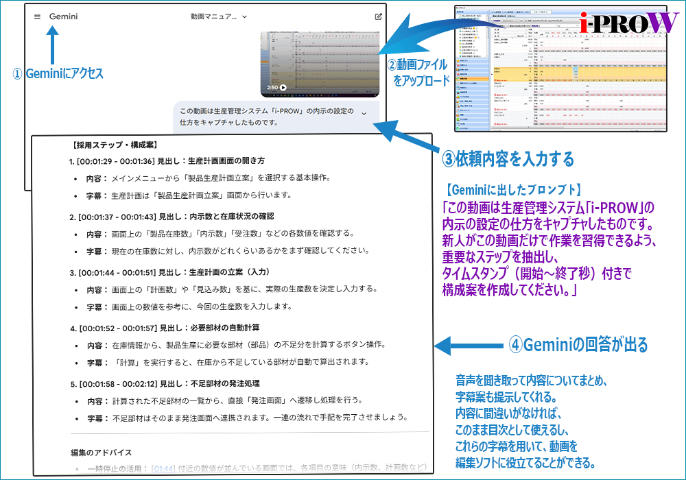 以下は、当方がテスト的に生産管理システム「i-PROW」の操作動画の一部をキャプチャし、その1分程度の動画をGeminiに要約させたときの結果になります。(クリックで拡大)